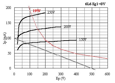 RL(Ω) Ep(V) Eg2(V) Ip(mA) Ig2(mA) Ik(mA) Pp(W) Pg2(W) 理想最大出力(W) 10KΩ 282V 250V 42.4mA(推定) 2.9mA(推定) 45.3mA 11.96W(推定) 0.73W(推定) 8.99W スクリーン・グリッド電圧(Eg2)が250Vのときの6L6のプレート特性に、上記の条件のロードラインを引いてみました。