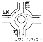さてラウンドアバウト(右図)です。英国の道路には交差点というものがあまりなく、どちらかというとラウンドアバウトという時計回りのロータリーが主流です。ラウンドアバウトは、電気のない馬車しかなかった時代に考案された交通システムです。馬車は、停止・発進が苦手でしかも急な右左折ができないので走りっぱなしでいけるロータリー方式は合理的です。それに、日本と違って郊外では家など滅多にないため、今でも交差点に信号機をつけるために電気を引くことができませんから。