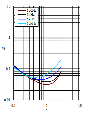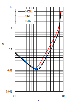 ライン入力における周波数特性および歪率特性は以下のとおりです。0dB=1Vで表示しています。歪率は帯域=80kHzで測定しています。歪率特性は完成直後は最低歪率は0.15%以上ありましたし、最大出力電圧ももうすこし低かったですが、回路定数を見直しつつチューニングを行ったところだいぶ良くなりました。