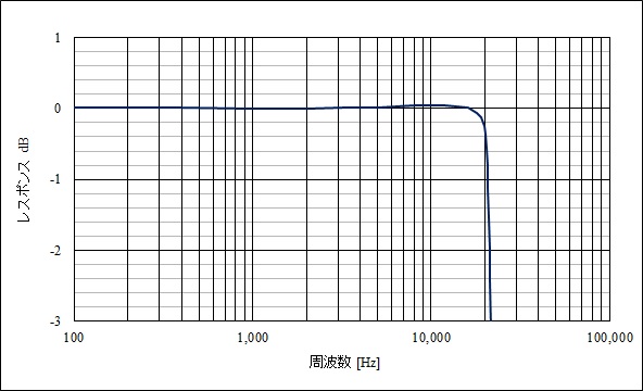 オーディオジェネレータを持っていない方でも、以下のグラフを参考にしつつ、フリーソフトのWaveGeneと電子電圧計があればある程度のチューニングが可能です。下のグラフはWaveGeneを使って100Hzから21kHzまで発振させ、それを本機のプリ出力で精密に測定したデータで、TD-1でチューニングしたものです。縦軸を拡大してありますので1kHz〜20kHzの状態がよくわかります。この高域減衰特性は「AKI.DACの特性」と「本機のLPFの特性」と「本機のラインアンプの特性」が混ざったものです。もし、ラインアンプのトランスのチューニングがうまくてきていないと、この特性から著しく逸脱します。