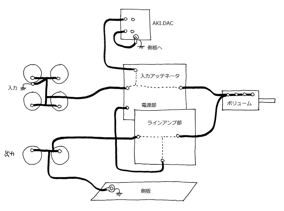 入力端子およびAKI.DACからのアースは入力アッテネータ基板のところで合流し、ボリュームを経てラインアンプ部に至ります。ラインアンプ部を出たアースは出力端子につながってゆきます。電源部のアースは独立しているので、別途ラインアンプ部とつないでやります。