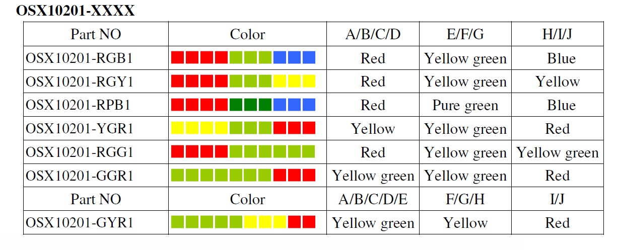 このLEDアレイはごく単純に10個のLEDを1つにまとめたもので、駆動回路などは全くついていません。カラー構成が異なるさまざまなモデルがあります。本機で使用するのはOSX10201-GYR1です。テクニカルドキュメント:OSX10201
