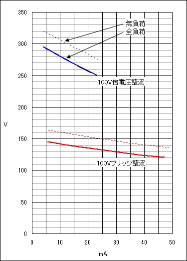 12.6V巻き線をブリッジ整流した場合、無負荷の時で19V前後、0.15Aの時約17V、0.3Aでは約15.5V、定格一杯の0.47Aを取り出した時で約14Vです。