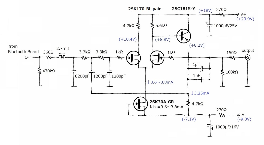 2SK30A-GR(または2SK246-GR)を無作為に選んでIDSS値を測定すると、3.2mA〜4.6mAくらいの範囲に収まります。これらはどれでも使うことができます。そのために必要なのは、ドレイン側の負荷抵抗(5.1kΩと6.2kΩ)の値を変えればいいのです。そのための条件は、定電流値が変わっても差動回路の右側のドレイン電圧(回路図では8.8V)が8.8V±10%の範囲になるようにすればいいだけのことです。
