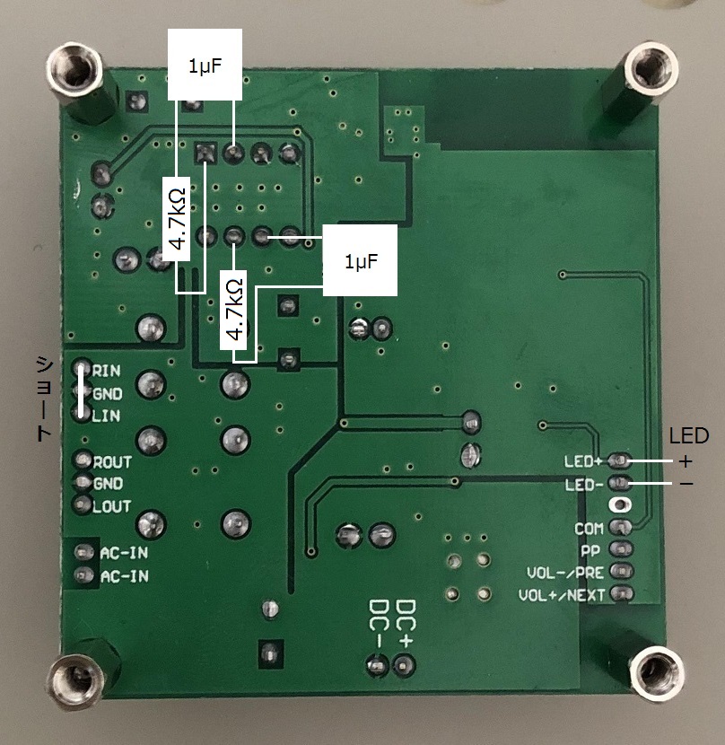 2.2kΩは33Ωでバイパスさせます。これはDACの基本特性がAKI.DACとBluetoothとで10kHz以上の帯域で微妙に異なるのを微調整するためです。LCフィルタ(2.7mH+8200pF)からみたソース・インピーダンスが、AKI.DACの時は360Ωであるのに対して、Bluetoothの時は393Ω(=33Ω+360Ω)とやや高めになるようにチューニングしています。リレーで切り替わる外部入力は使用しないので、そちらに切り替わった時にオープンにならないようにショートさせておきます。電源ノイズの低減のための470μF/16Vの取り付けについてはVersion1と同じですので詳しい解説はVersion1を参照してください。