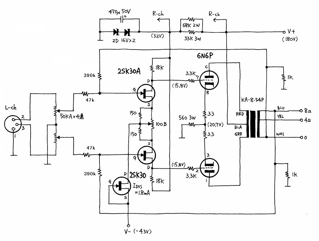回路図は以下のとおりです。回路図上には記述していませんが、初段の32.5Vの電源と5.7Vの電源は左右共通です。2SK117はBLランクから選別、2SK30AはGRランクからIdssが3.66±0.1mAのものを選別、2SC1815はYランクを使いました(初期はGRランクでしたが変更しました)。電源回路は、パワーアップ版6N6P全段差動PPアンプと全く同じです。