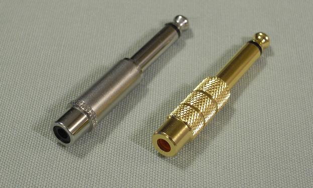 実際の製作では、入力端子にキャノン/TRSコンボジャックを使いました。キャノンの場合は、2番がHot、3番がCold、1番がアース(GND)になります。コンボジャックには中央にTRSを突っ込む穴もついています。TRSの場合は、TipがHot、RingがCold、Sleeveがアース(GND)になります。本機の入力にアンバランスのRCAケーブルをつなぎたい場合は、画像のようなRCA→TRS変換アダプタを使います。このアダプタは、内部的にRingとSleeveがショートしていますので、これを差し込むとCOLD側がアースされるしくみです。