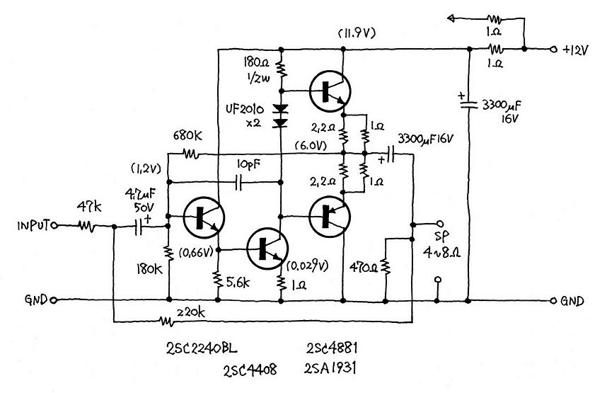 前述のヘッドホンアンプの回路をベースにして、4〜8Ωのスピーカーを駆動できる回路にアレンジしたのがこの回路(下図)です。初段の2SC2240と次段の2SC4408は、実質的にはダーリントン接続(※)になっており、増幅作用はもっぱら2SC4408が受け持ちます。出力段は、2SC4881と2SA1931のコンプリによるSEPP-OTL回路(※)です。