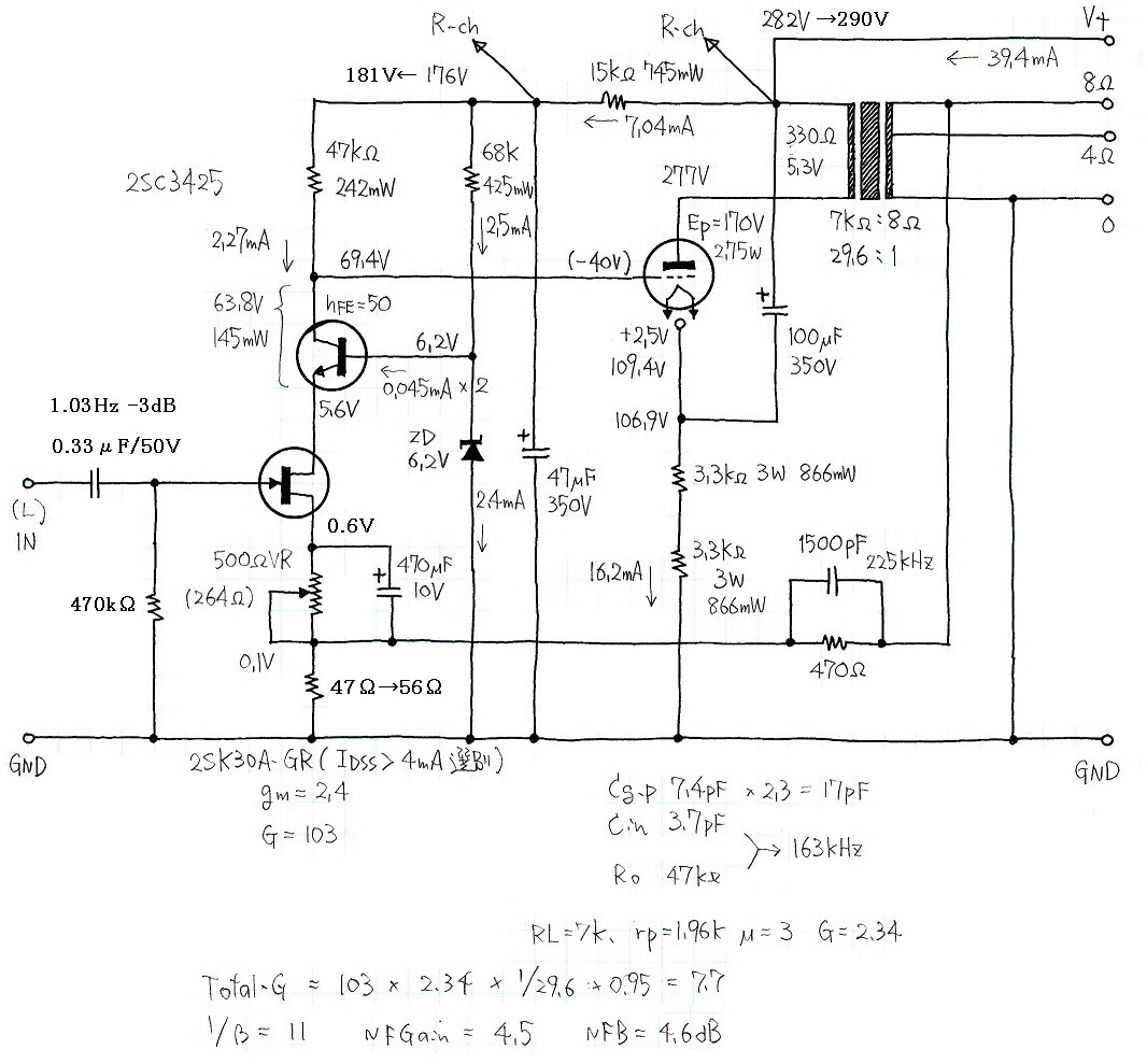 最終回路図は以下のとおりです。初段電源のバイパスコンデンサ容量が、当初は47μF/250Vであったのを100μF/250Vに変更しました。これにより、低域の左右チャネル間クロストークが改善されています。初段バイアスを調整するための半固定抵抗器は、回路図では1kΩとなっていますが、実際には500Ωのものを使っています。