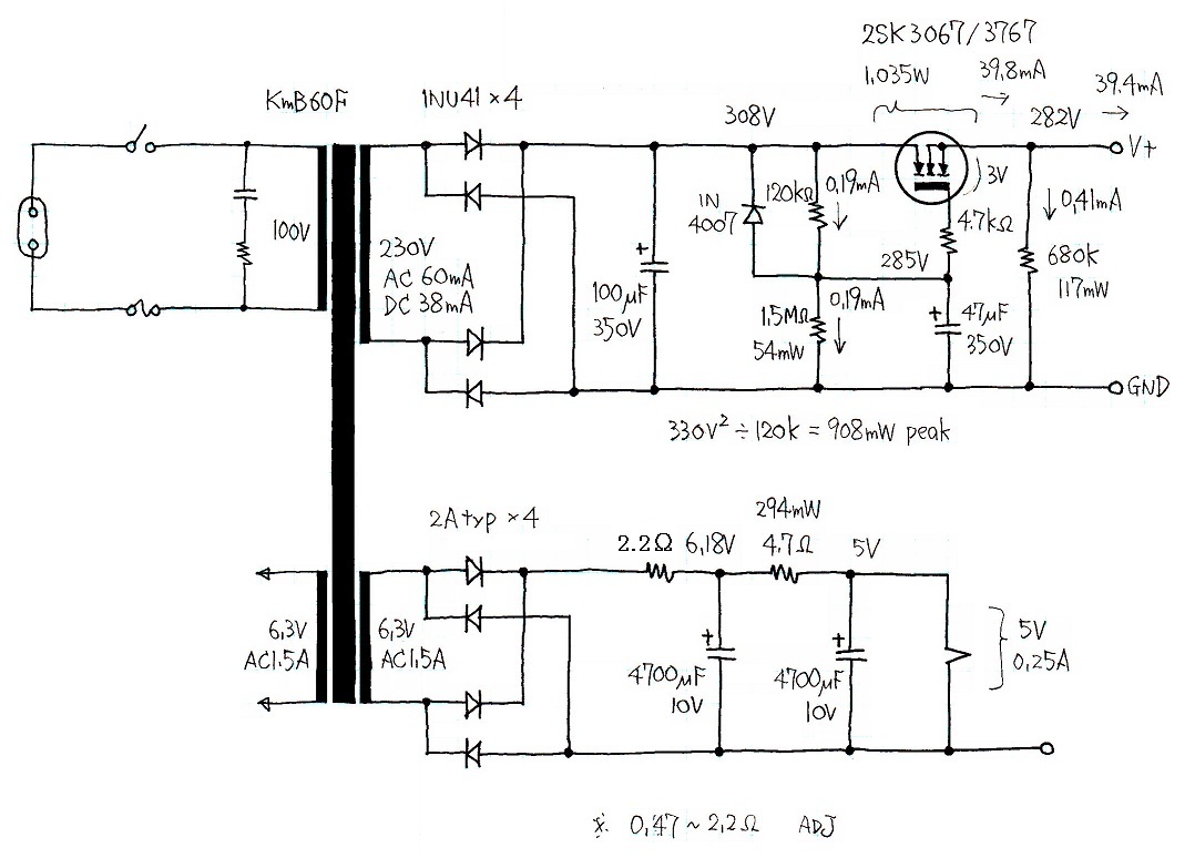 下図は上記の右側の回路に適合した電源回路の検討メモのスキャンですが、左側の回路にもほとんど適合します。