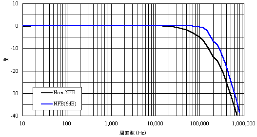無帰還で10Hz〜70kHz(-3dB)、負帰還6dBで10Hz〜140kHz(-1dB)、しかも200kHz以上はピークなしの素直な減衰特性ですから、一般的にみればかなりいい線いっています。