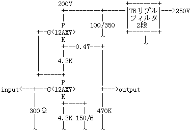 12AX7パラレルの時 50Hz 1kHz 20kHz プレート負荷抵抗 (a) 75kΩ 75kΩ 75kΩ ボリューム回路入力インピーダンス (b) 50kΩ 50kΩ 50kΩ RIAA素子インピーダンス+初段カソード抵抗 (c) 600kΩ+2.7kΩ 85kΩ+2.7kΩ 8kΩ+2.7kΩ 合成総合負荷インピーダンス (a//b//c) 29kΩ 22kΩ 8kΩ 12AX7パラレル内部抵抗 40kΩ 40kΩ 40kΩ 12AX7パラレルμ 100 100 100 12AX7パラレル利得 41.7倍 35.8倍 16.5倍 利得のバランスと、各段の裸利得や負荷の重さと相談の結果が本機の利得配分というわけです。ただ、12AX7/ECC83の出力インピーダンスがあまりに高いので、終段だけはパラレル接続にしています。今だったらパラレルではなくSRPPにしたでしょう(その方が出力インピーダンスが低い)。