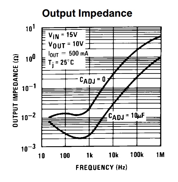 Adjust端子を交流的にアースすると出力インピーダンスを下げることができます。それをやっているのがC1(10μF)です。右上の図は、C1の有無を比較したデータです。100Hz以上の全帯域にわたって著しい改善があります。オーディオ帯域で0.1Ω以下、1MHzでも1Ωですからなかなか優秀です。C1は10μFあれば十分で容量を増やしても効果は同じです。それよりも高周波特性が良好なことが重要で、テクニカル・ドキュメントはタンタル電解コンデンサの使用を求めています。