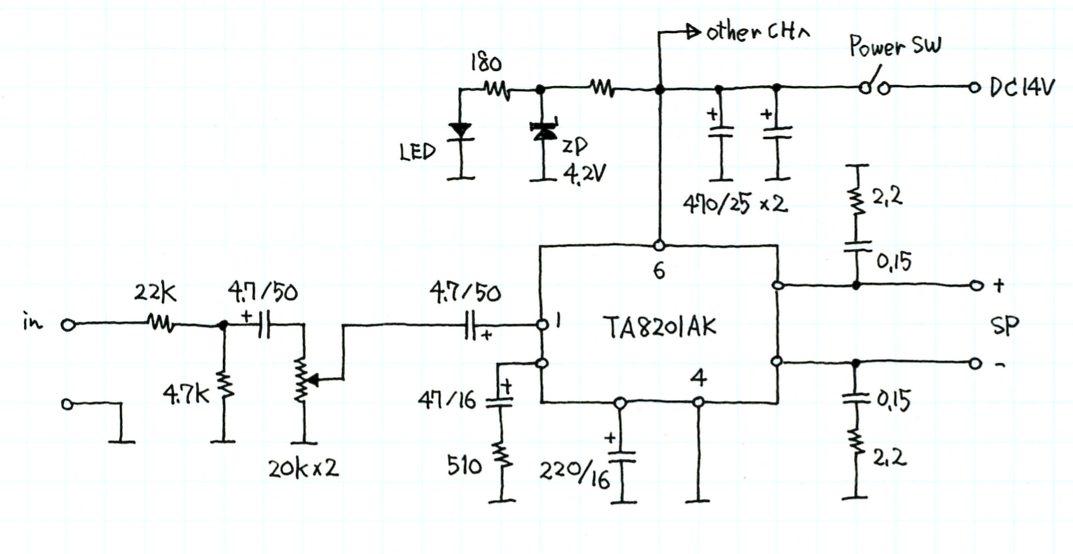 新たな回路は下図のとおりです。パワーアンプICはTA8207Kよりもはりかにましな東芝製TA8201AKを使いました。残念ながらこのICは製造中止かつマーケットから姿を消しました。LEDまわりやボリュームまわりは元のプリントパターンを生かしています。入力のところに2ヶ所もコンデンサ(4.7μF)がはいっているのは、単に頭が混乱していたからでボリュームの前のコンデンサはいりません。ICまわりの回路および部品はほぼ東芝推奨どおりです。利得は許容されるぎりぎりまで下げていますが、それでも過剰なので入力のところで22kΩと4.7kΩによるアッテネータをつけています。なお、下の回路図は片チャネル分だけです。